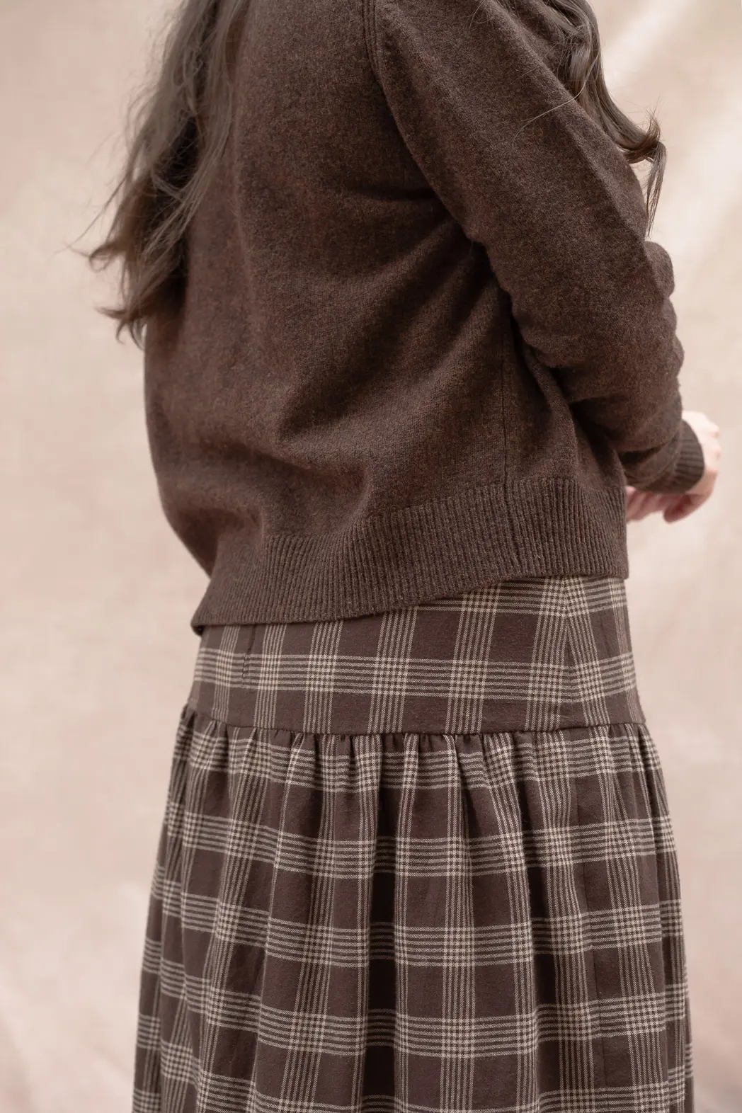 Quand j’ai imaginé cette jupe, je suis partie de la coupe. Je voulais une ligne structurée avec un empiècement qui épouse les hanches, puis un volume froncé qui apporte du mouvement et de la légèreté. Je la voulais idéale pour la mi-saison, suffisamment chaude sans être lourde. J’ai donc choisi une flanelle douce, légèrement duveteuse, qui retient la chaleur tout en restant respirante.