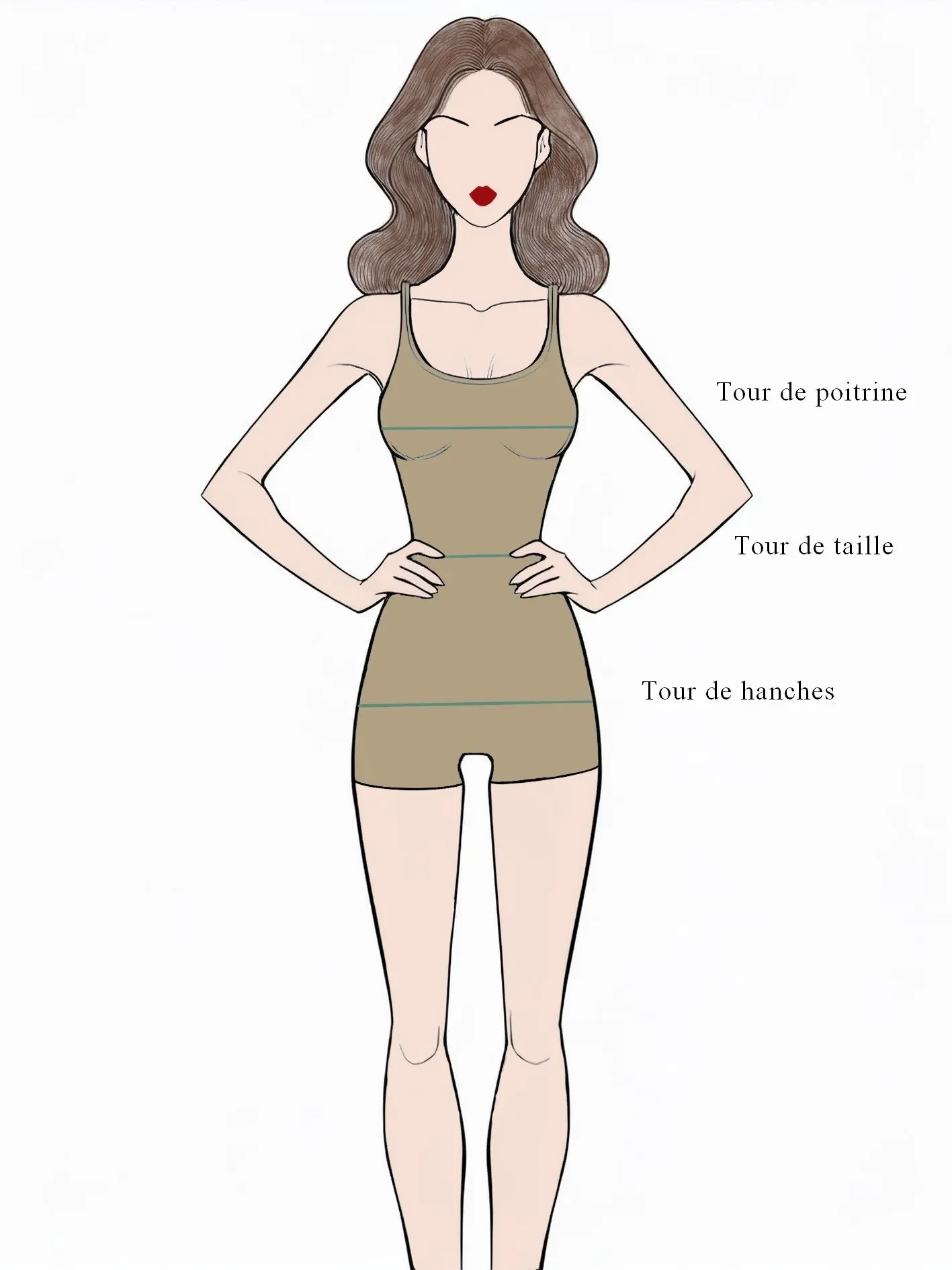 Pour prendre tes mesures correctement, il est essentiel de porter des vêtements ajustés qui ne gênent pas la prise de mesure. L'idéal est d'être en sous-vêtements, ou de porter un justaucorps ou un body. Pense aussi à porter le soutien-gorge que tu souhaites associer avec la pièce que tu commandes — un modèle qui maintient bien la poitrine. Ne porte pas de chaussures, tu dois être pieds-nus, jambes droites. Enfin, il faut prendre ses mesures le matin avant d'avoir mangé.