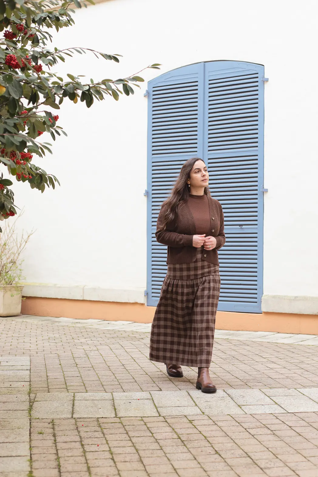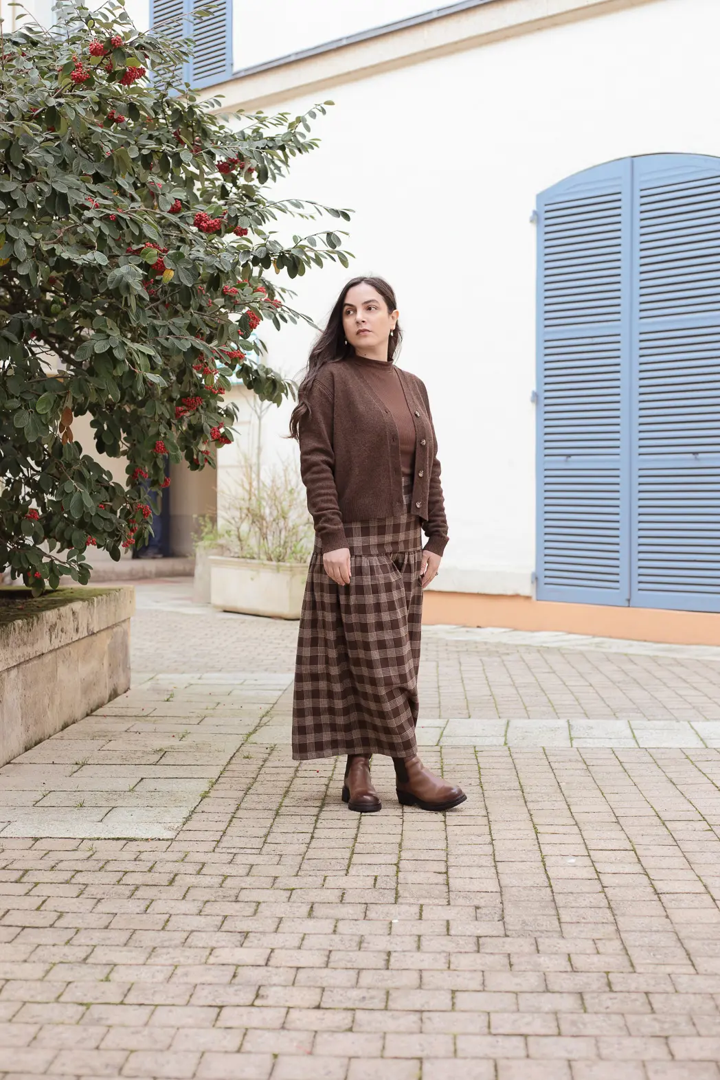 Viola est une jupe en flanelle de coton à carreaux. Entièrement doublée dans une viscose fluide, elle offre une belle tenue et un confort idéal pour la mi-saison comme pour les journées plus fraîches. Sa découpe est soulignée de fronces délicates. Elle se ferme par un zip discret au dos, pour un ajustement parfait. Un modèle à associer aussi bien à une maille qu’à un top plus léger.